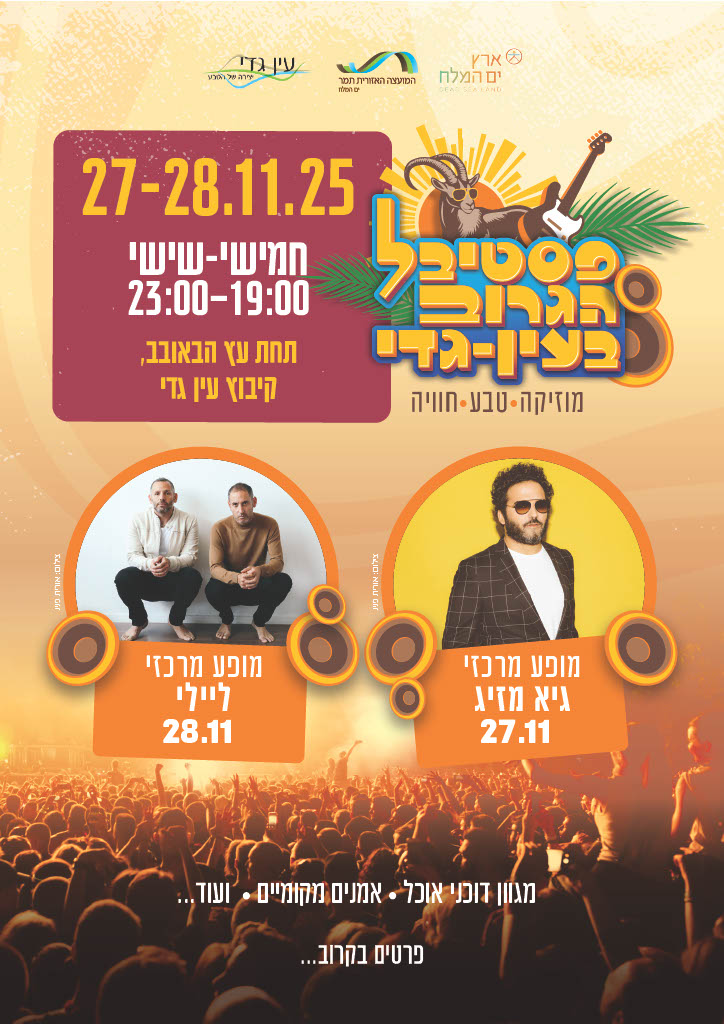 • 21:00 – הופעת ג'אז בבר המלון – הרכב ג'אז של פנימיית ״ביכורים״ מהכפר החינוכי עין גדי – חממה למצוינות באומנות ומוסיקה – ינגנו מוסיקה מגוונת ועשירה במנעד סגנונות בתוך הז'אנר של הג'אז.